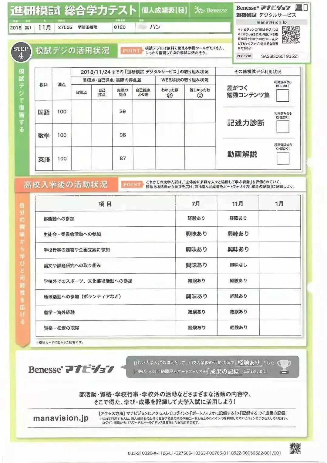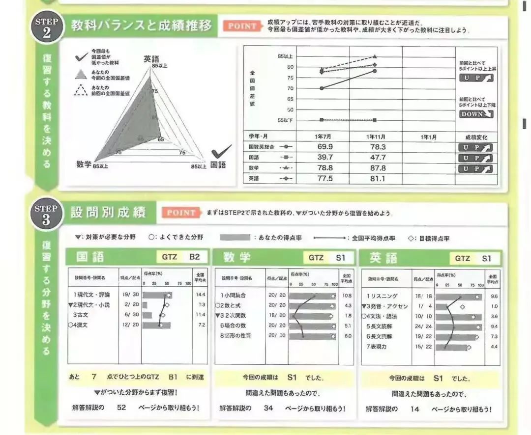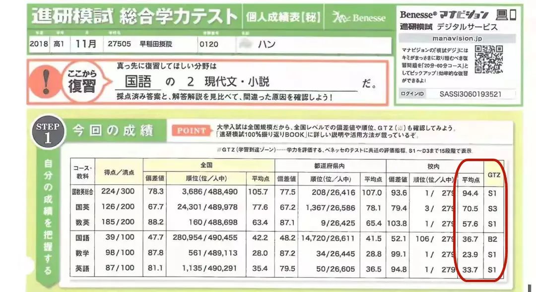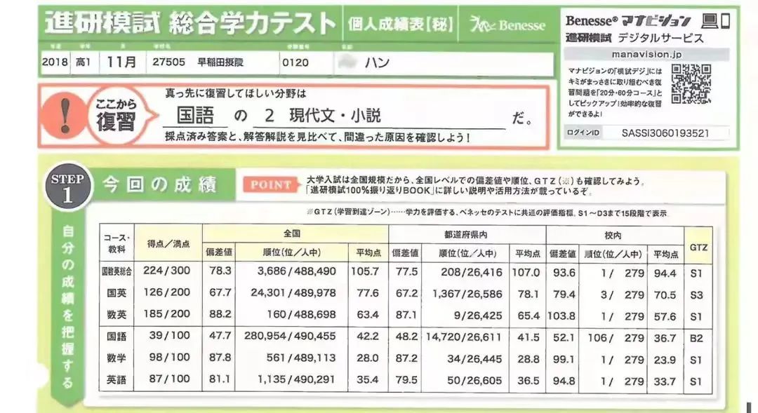 其目的是在于通过定期的学力测定,帮助高中生的学力培养以及辅助学生们更好的选择升学之路。在不同的时期会有不同的出题内容和形式。在客观的全国大数据的支撑下,能有效的帮助学生测试自己的成绩层次以及对之后学习的预测。下图是此前考入早稻田大学附属摄陵高等学校(偏差值65)的童鞋的進研模試成绩单: