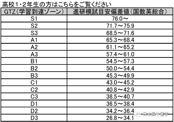 GTZ(学習到達ゾーン):即学习达到的区域(或层次)。一般分为S,A,B,C,D五个大档位,右下脚注1,2,3来表明更具体的档位。通常表达的意思主要是标注成绩所达到的大致偏差值数值。下表是日本高一高二GTZ对应的大致偏差值表: