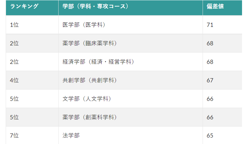 除开在日本大学中地位超然的医学部,九州大学内部最优秀的学部是药学部和经济学部,偏差值达到了68,这两个学部均是九州大学具有传统特色的王牌学部,也是国公立大学中知名的难关学部。