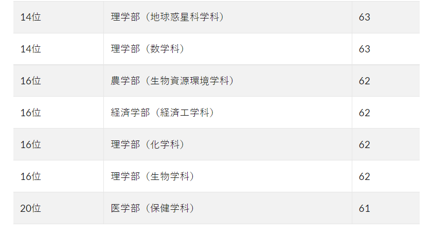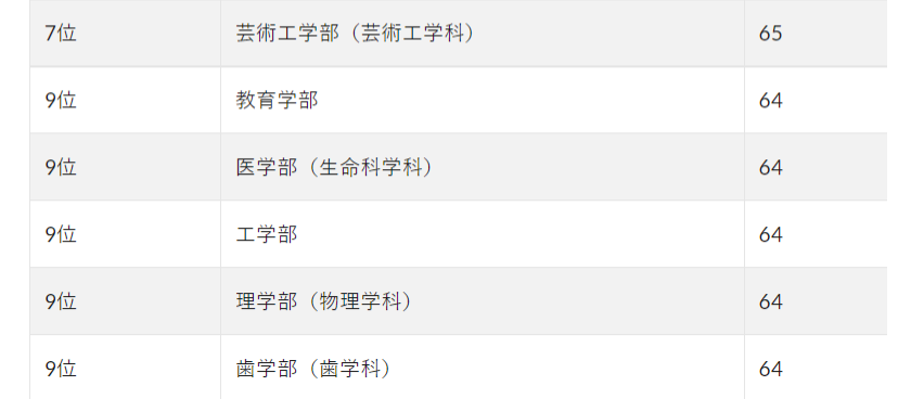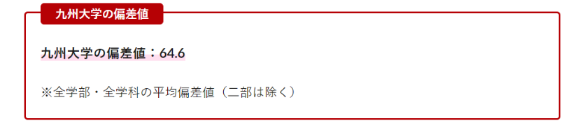 九州大学所有院系的平均偏差值达到了64.6。九州大学作为旧制帝国大之一,一般被认为是一流的国立大学,偏差值“仅为”64,是因为作为综合型大学,学部非常多而导致的,是很多日本高中留学生一直向往的大学。