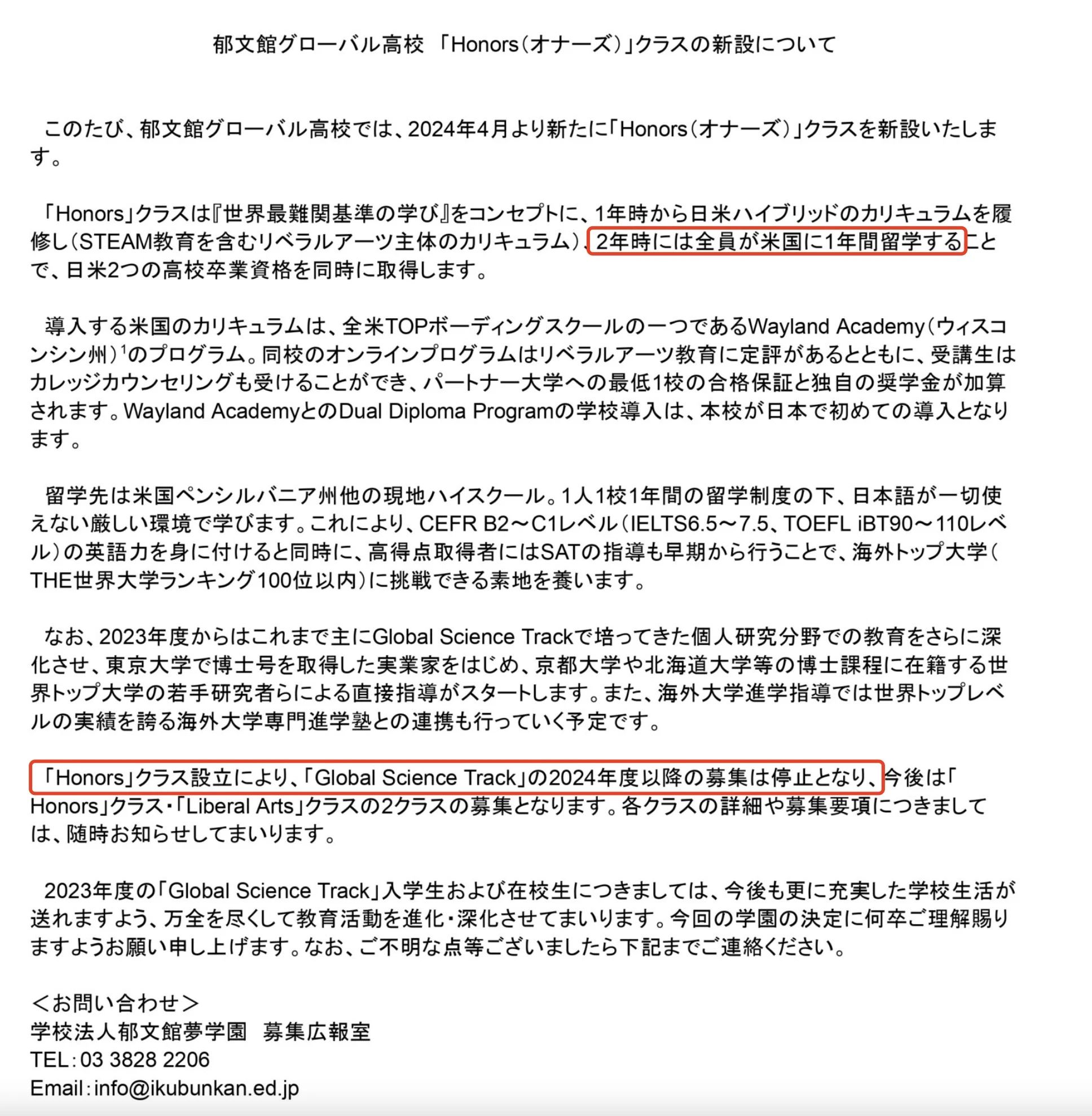 对于将在2023学年入学”Global Science Track“或目前正在学习这个课程的学生,我们将努力发展和深化教育活动,以提供更充实的学校生活。我们恳请您对此决定予以理解。