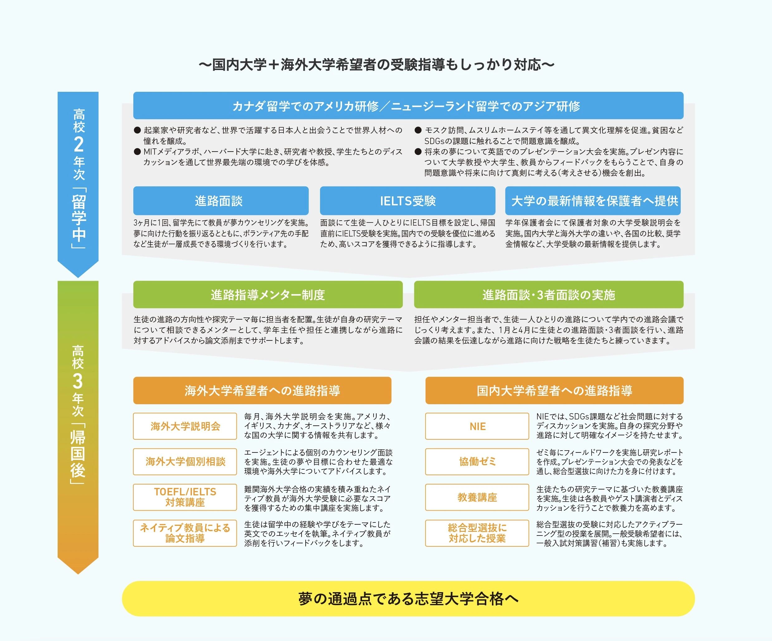 学生将在美国宾夕法尼亚州和其他州的当地高中学习。他们将置身一个完全不能使用日语的具有挑战性的环境。这将有助于他们获得相当于CEFR B2-C1水平(相当于雅思6.5-7.5,托福iBT 90-110水平)的英语技能,此项目向英文高分学生提供早期SAT(美国高考)指导。这将帮助他们夯实挑战世界前100的海外大学的基础。