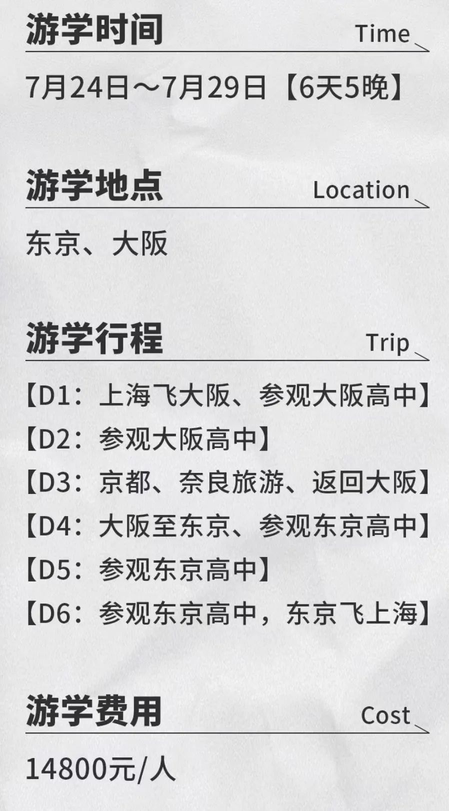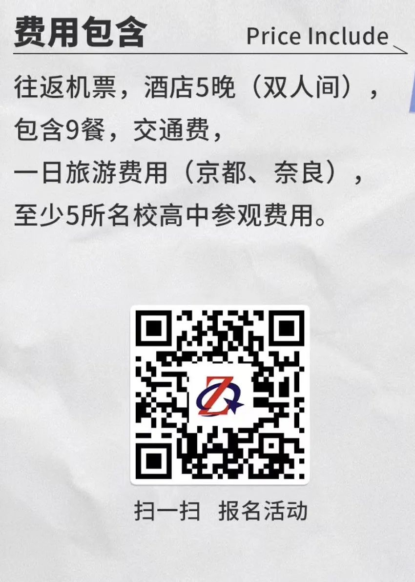 这个暑假,和我们一起去日本探校吧!六天五夜那种!关东关西名校一网打尽!下面有每个学校的详细介绍!如果还有不清楚的,可以扫描最下方的二维码,添加我们的小滋老师进行咨询哦!有可以直升早稻田大学的早稻田摄陵;有直升文化学园大学、文化服装学院的文大杉並;有理数特色的宝仙学园(校长是网红那种);有全国前十的日本“衡水”—西大和学园;有自由校服制度的大阪名校桃山学院附属高中;有筑波大学升学「茗」校,茗溪学园;还有什么学校呢?等你来解锁哦!