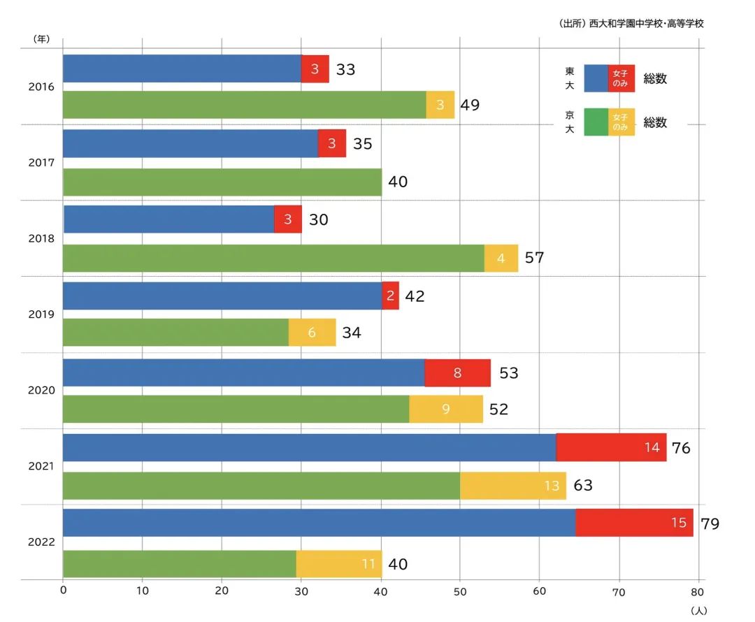 另外,大阪府的高中停止使用“学区制”,并在2011年引入了全球领袖高中(Global Leaders High Schools)这一制度,将包括北野和天王寺在内的10所学校指定为「高等教育指导的专门校」。 西大和如果不做些什么,可以预见的是,从这些学校录取到京都大学的学生数量将极大地增加。