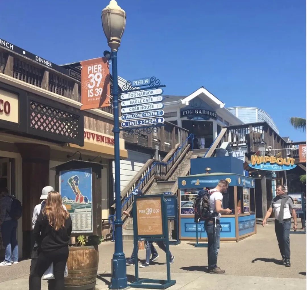 在39码头,可以远眺天使岛、阿尔卡特拉斯岛、金门大桥和旧金山-奥克兰海湾大桥等。蓝金舰队海湾游船从码头39出发。
