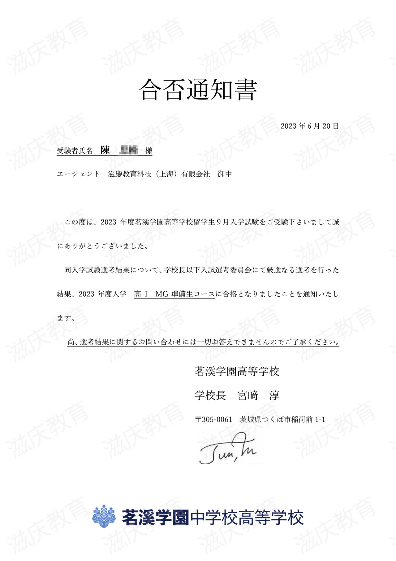 来自这个月末的好消息!我们滋庆今年申请23年8月高一下插班的两名学生,都获得了茗溪学园高等学校的录取!废话不多说,我们先上录取通知书给大家看一看!