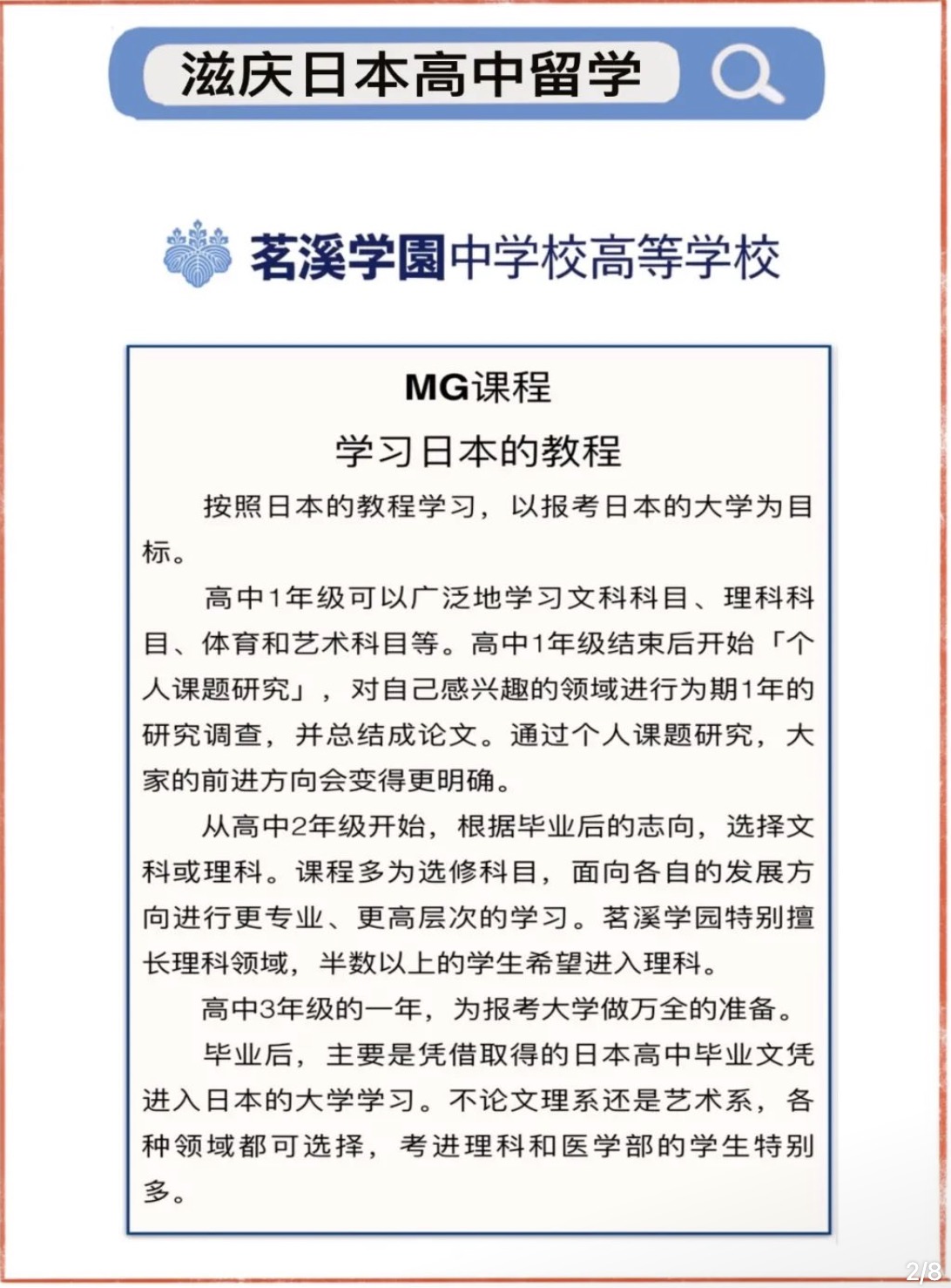 作为偏差值高达67的日本名校高中,茗溪学园在师资力量雄厚,尤其在理科方面有得天独厚的优势。选择传统MG课程的学生可以在高三以前选择自己感兴趣的【研究课题】自由发展,而在进入高三后会得到系统性的应试教育,让学生在日本大学入学考试中取得更好的成绩。