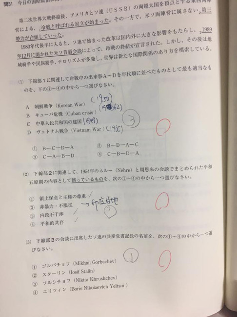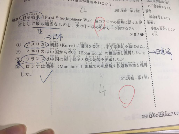 当然,也不是完全无据可依的。一般来说,如果这道题做对的人占大多数,那扣起分来会毫不手软;反之答案正确的人仅占一小部分的话,甚至有做错了也不扣分的可能性。从中可看出一步一个脚印的重要性,所以EJU高分诀窍的第一点就是书(此处特指文科生人手一本的『日本留学試験対策問題集ハイレベル 総合科目』)中出现过原文的内容绝不可以错(基础题)。
