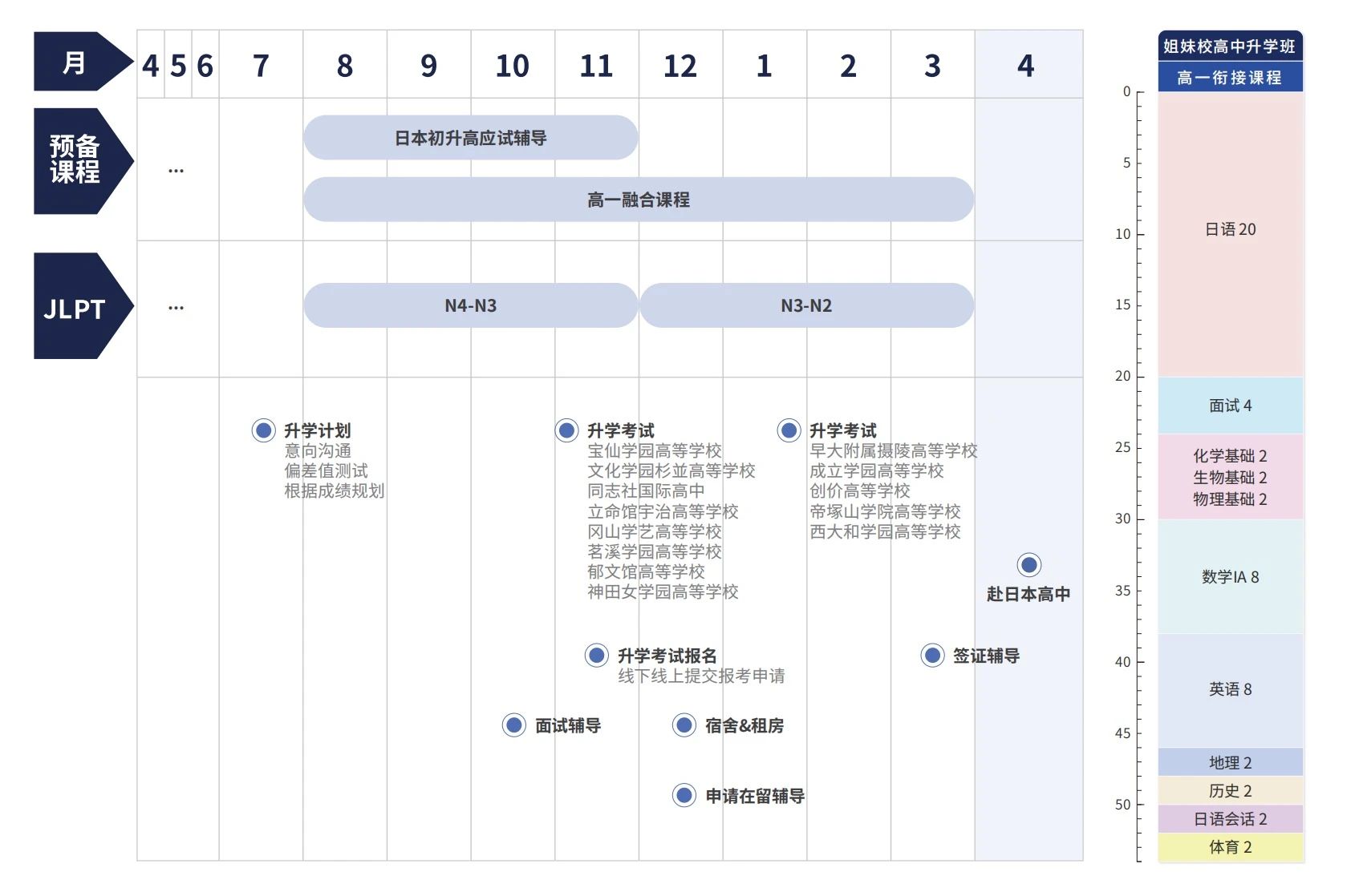 我们来看一下,这是我们滋庆日本名校高中直升班的课程安排情况: