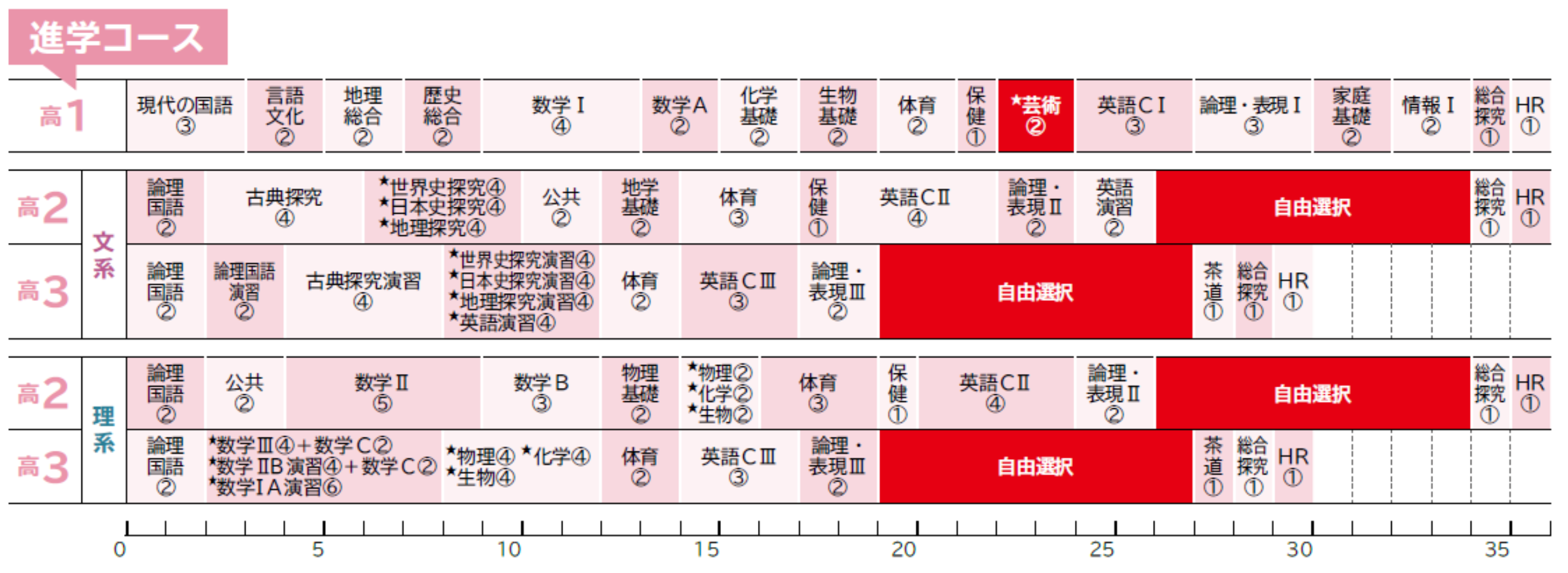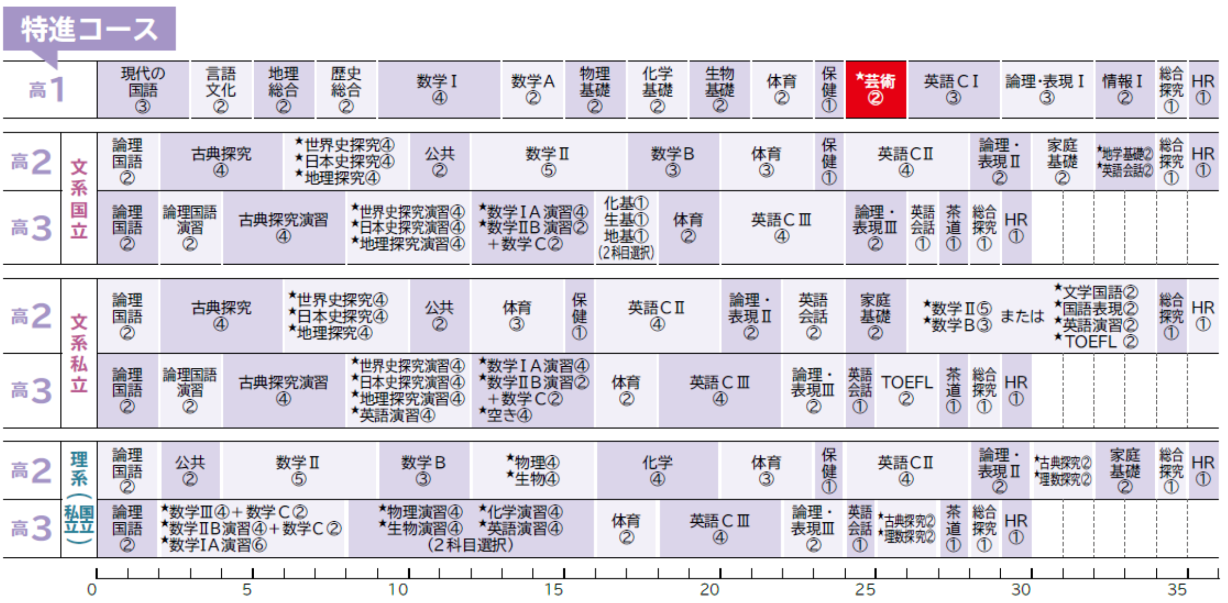 从上图中,我们可以看到文杉的特进课程班在高一是不分文理,一学年有16种课程。高二高三根据学生成绩与想要考的大学的类型进入不同的课程班做针对性的训练。从课程的安排中,也可以看出不同类型学校的考学取向。比如托福课程只有在私立文系特进班里出现,