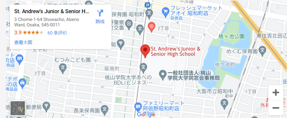 桃山学院位于大阪府大阪市阿倍野区,距离大阪市中心不远,最近的地铁站距离大阪中心地区站点“难波”只需要10分钟车程。