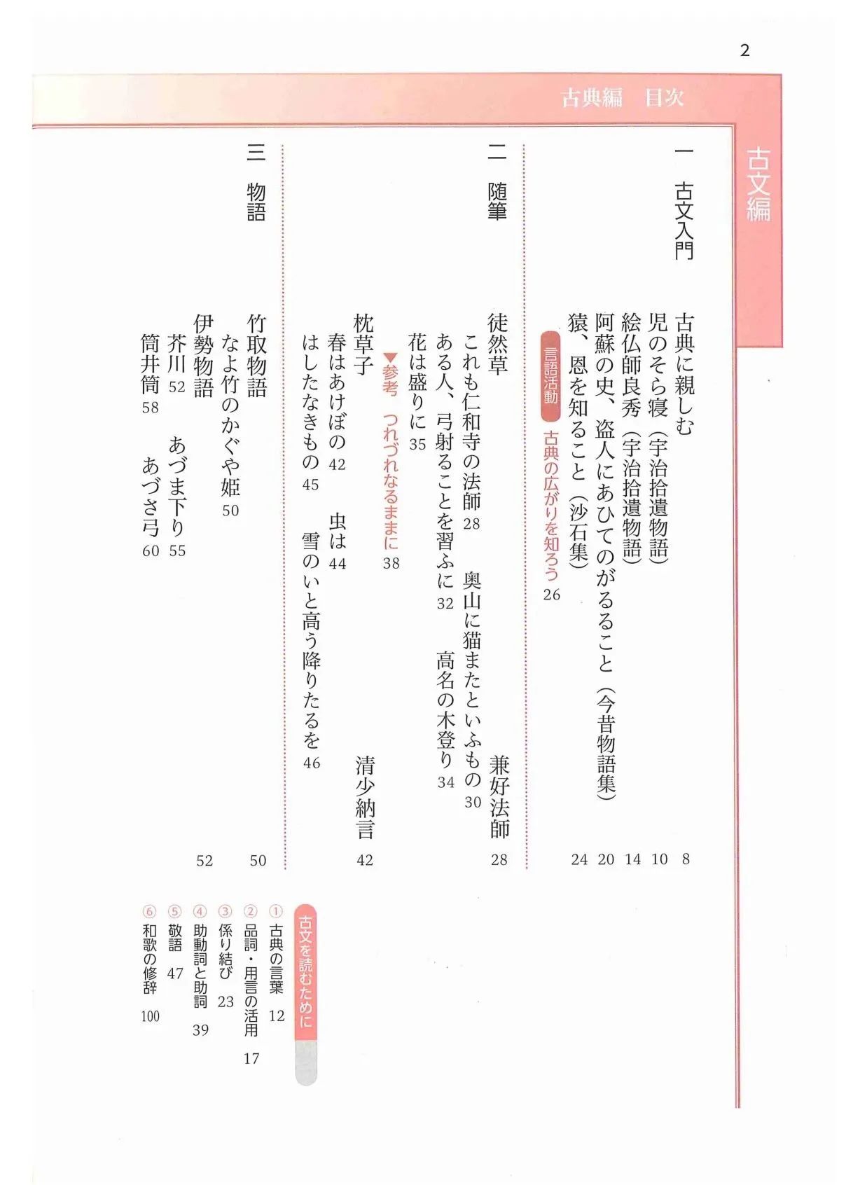 日本古文,是国语中《古典》的一部分。一般会讲一些古代日本作家的文章以及常见的创作形式。比如说物语、军记、和歌、绯句等等。日本的教科书出版商很多,每个学校的教材也不太相同。这里呢,我就截取了某家出版社的高中语文教材,和大家一起分享下日本古文的教学目录。