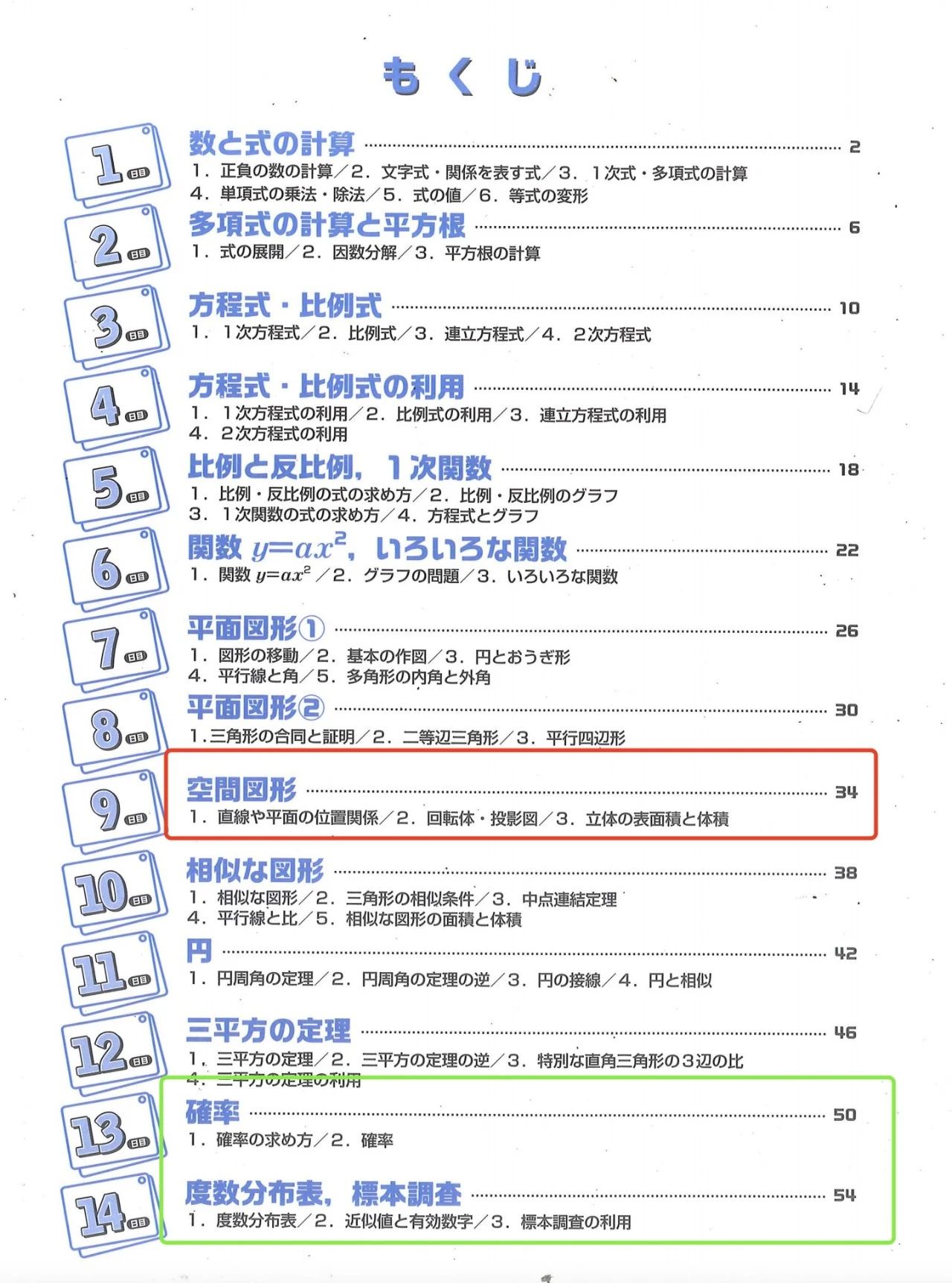 数学考试范围如下,其中红色框框里的立体几何是超纲部分,一般中国学生高二的时候才会学。而立体几何题一般占比10分,分值并不算低,且基本上以大题的形式出现。蓝色框框里的概率题对日语阅读的要求比较高一些,因为题干长,需要时间去理解与消化。但是在先期备考的时候,可以多尝试做一些不同类型的概率题,因为表达方面还是有固定的写法的。