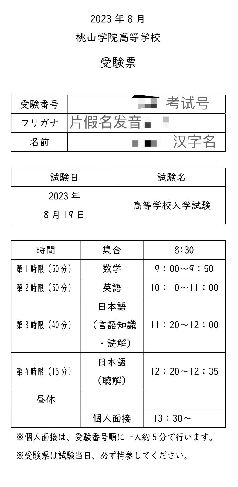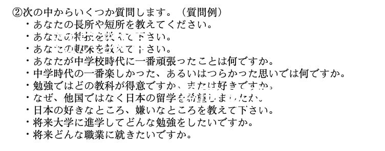 数学50分钟,英语50分钟,日语笔试40分钟,日语听力15分钟。四场考试之间有3次20分钟的休息时间。考完上午的笔试,学校会给学生55分钟的休息时间。学生此时要拿出自己带的便当享用。下午1:30开始个人面试。面试结束后学生方可离开考场。