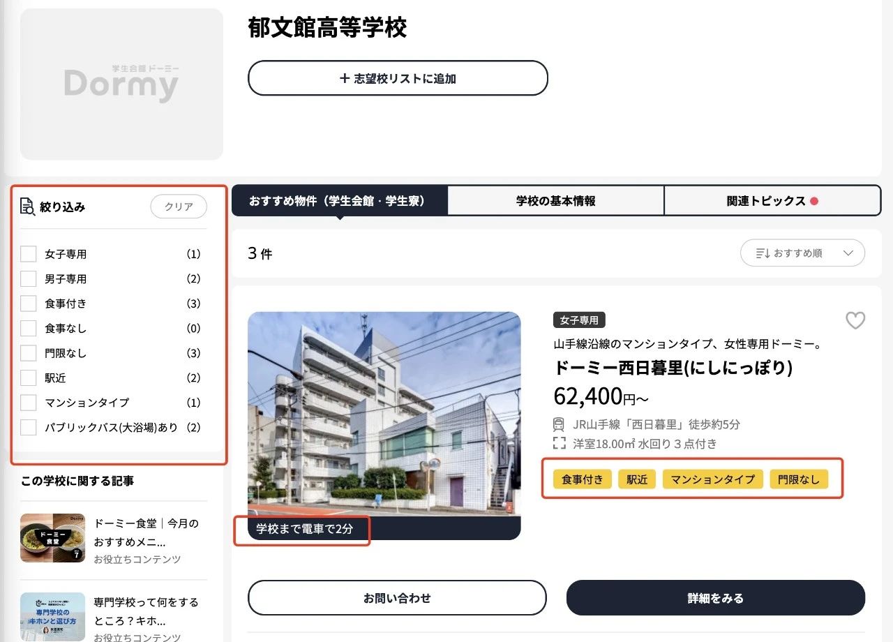 有的学生会馆会标明只允许男性或者女性居住,有的学生会馆则是男女生共住一栋楼。这些都是都是后期大家在选择学生会馆的时候可以考虑的。以郁文馆高等学校为例,我在网上找了一下学校附近的学生会馆: