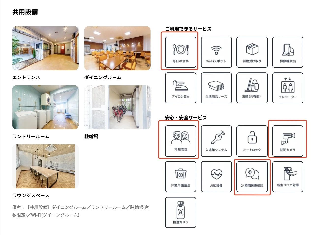 共用设施里,这是一家提供早晚餐的学生会馆。可以寄送包裹,租借清扫工具、电熨斗,有电梯、有公寓的管理人员,监控,并且附带24小时医疗咨询。AED也是完备的,遇到紧急情况的时候,这是可以救人命的。