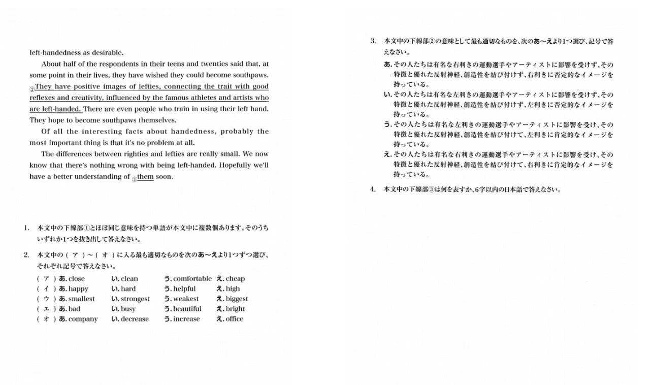 英语试题部分,除了常规的阅读理解题,语法题,日本初升高必考的重音题,发音题对于中国学生来说也是比较陌生的。除了发音题,还有一些日英双语解答题。在日本的英语试卷上可是会出现日语的哦!没想到吧!除了题型,题量也是很多学生需要注意的地方。平时在训练过程中,即使是50分钟的试卷,我们也要尽量在40-45分钟内做完,等到真正实战的时候,有一个容错空间。